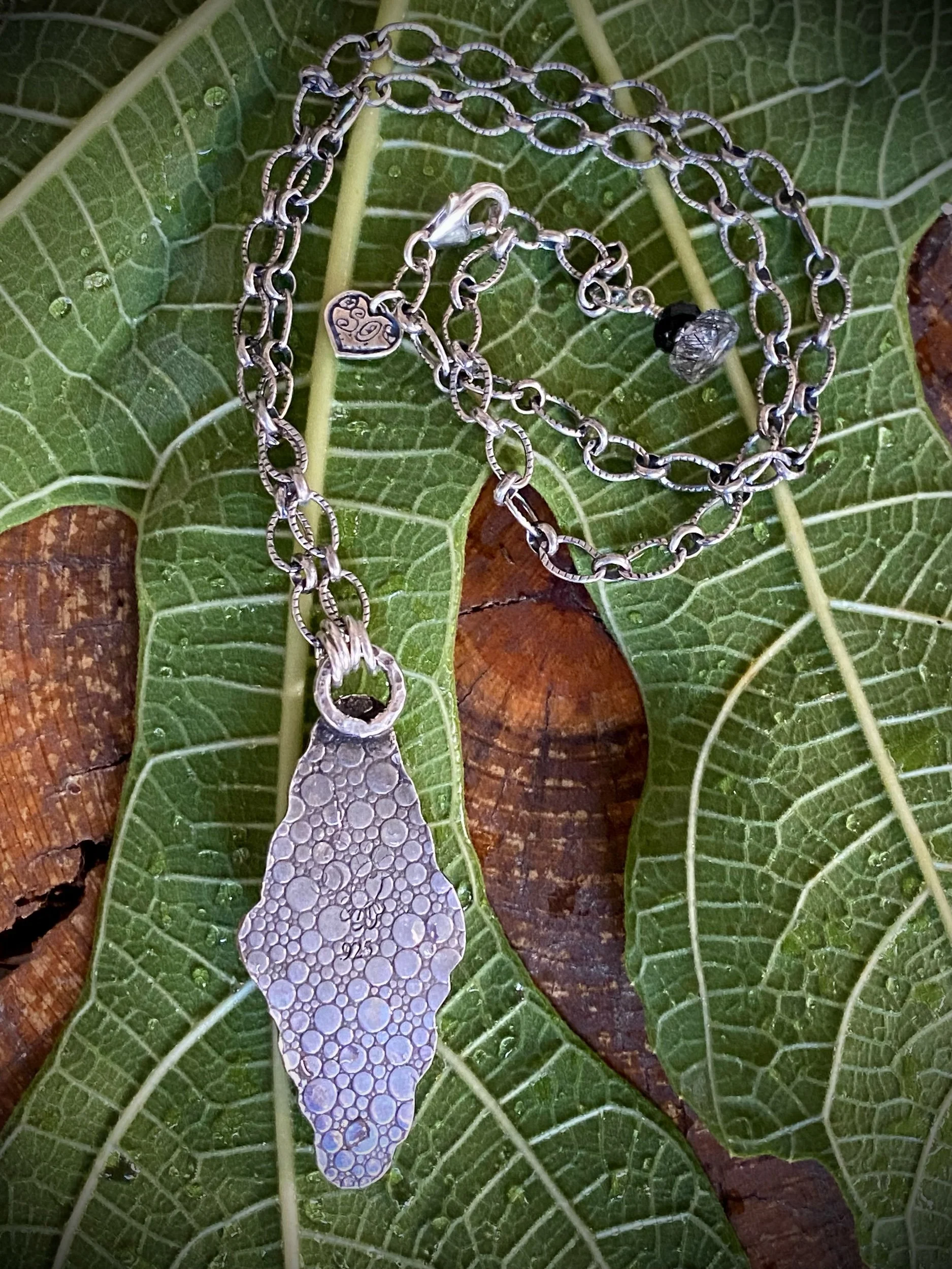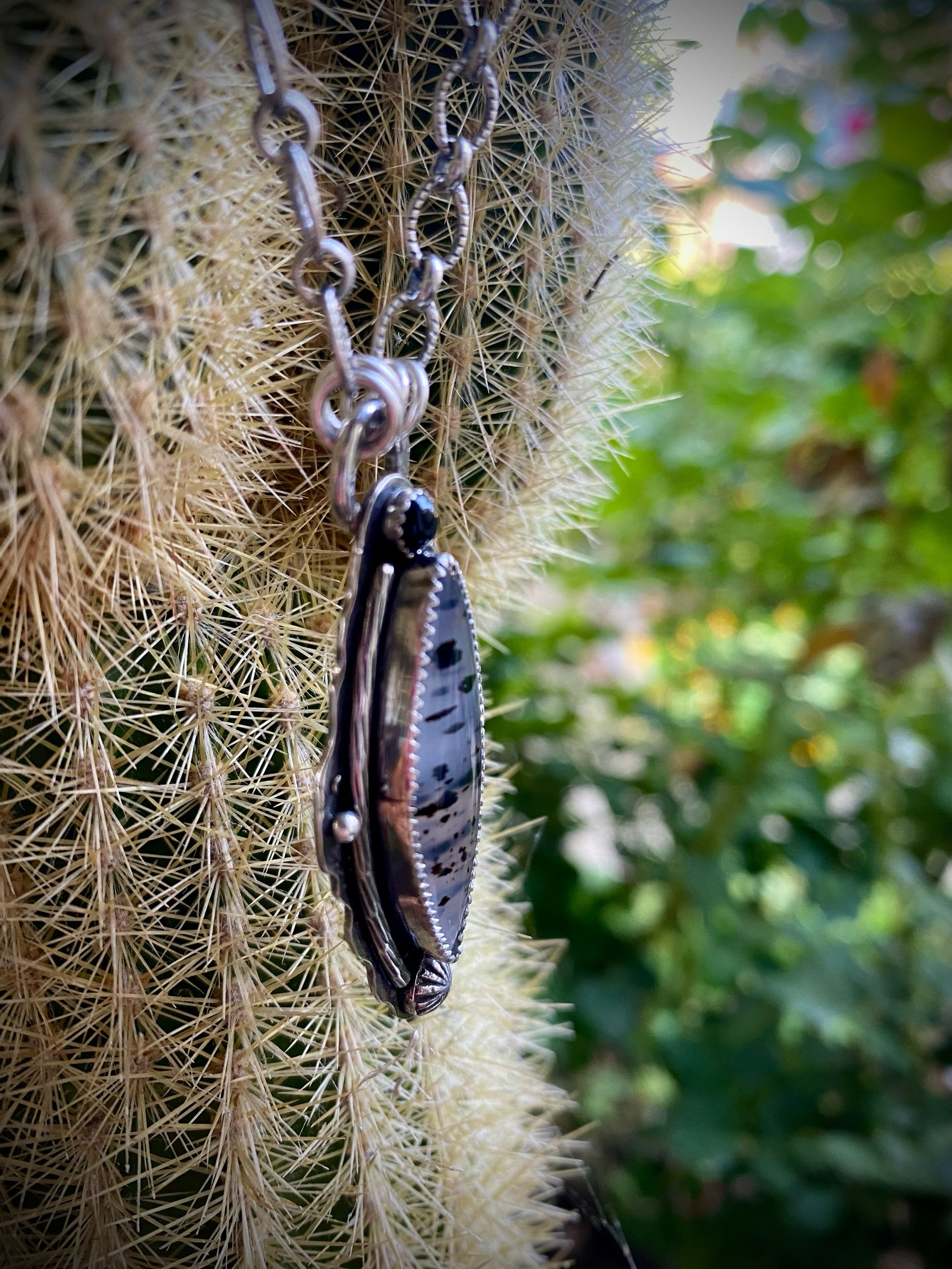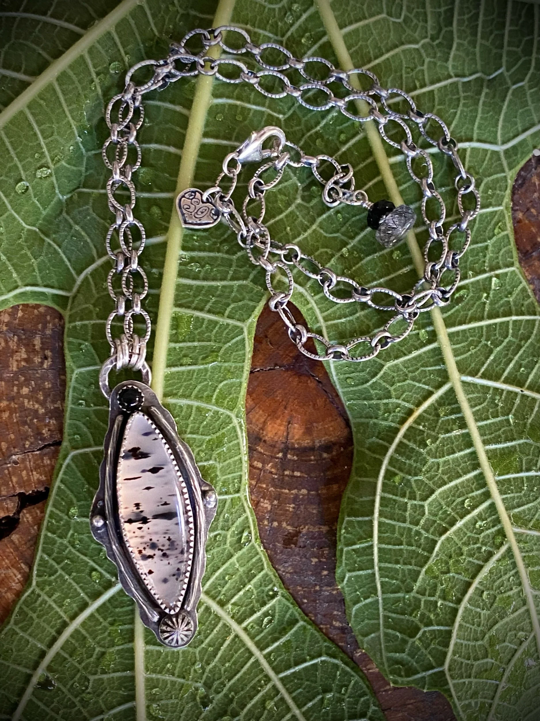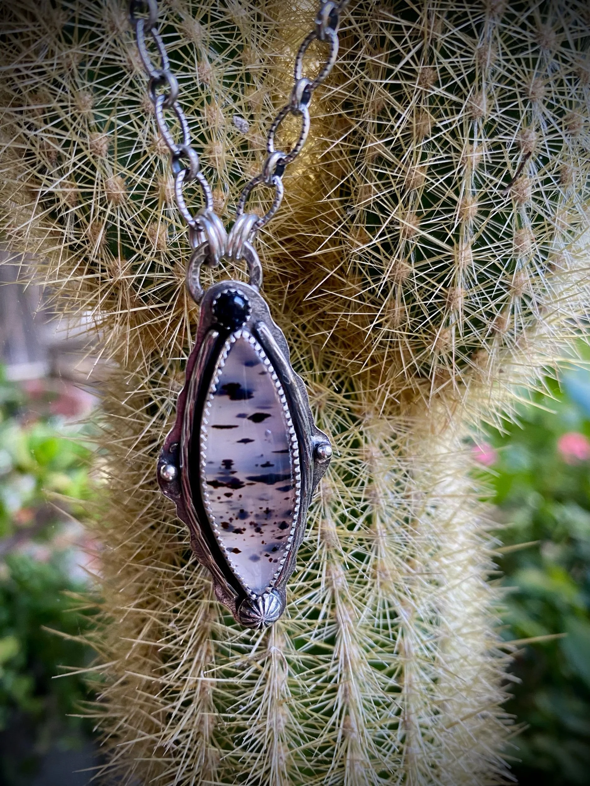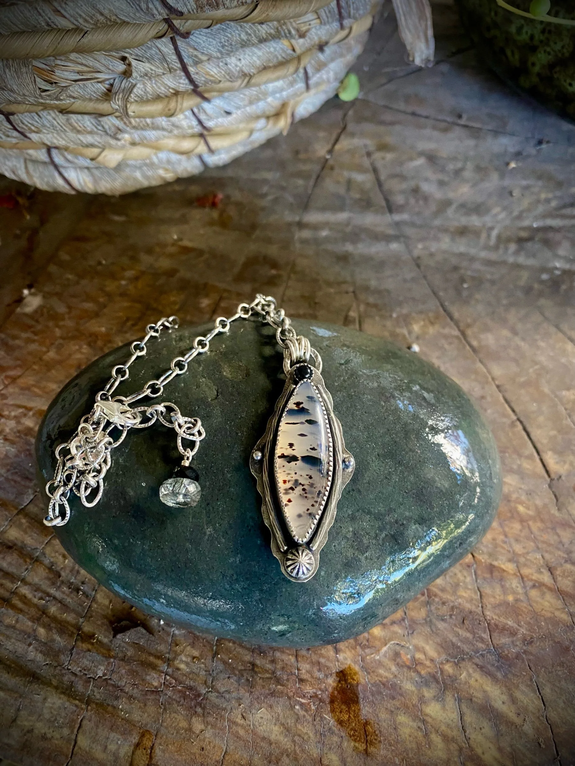 This dreamy Montana Agate pendant is hand fabricated in sterling silver and measures 2”. A sweet 4mm black Onyx adds the perfect contrast. The slightly oxidized , patterned long and short sterling chain measures 18”. The back of pendant has a pleasing pattern.